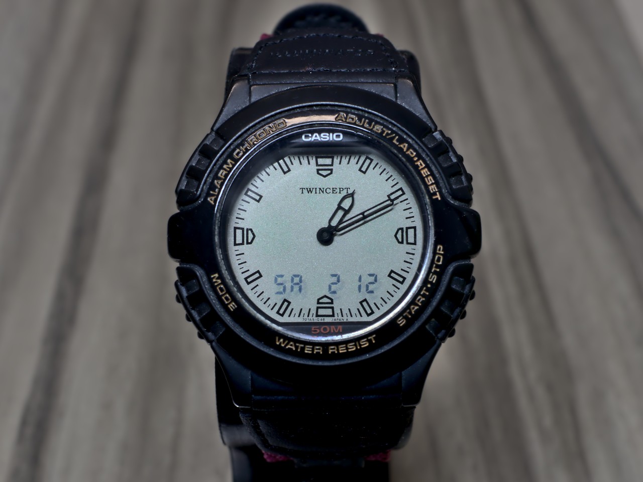 An analog/digital watch with twin display. Besides analog hands showing the time, this watch also offers a digital date/time display, alarm and stopwatch.
