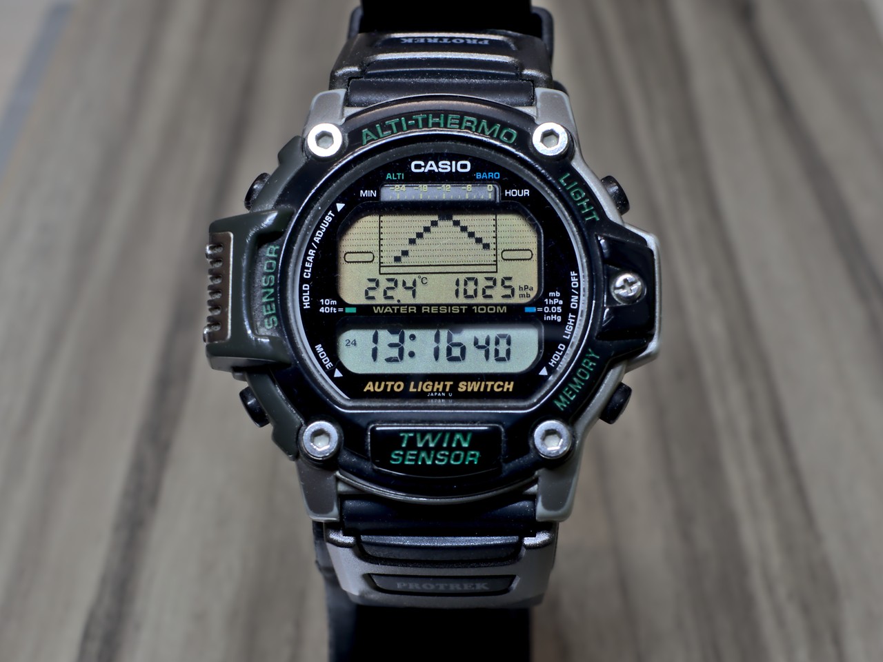 - The original textile watchband was worn out, but not available as spare part anymore. It has been replaced with an original Casio “ProTrek” resin watchband.